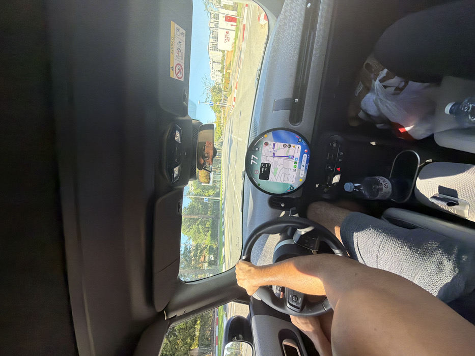 The image captures the interior perspective of a Mini Cooper vehicle moving forward on a clear day in Raanana, Israel