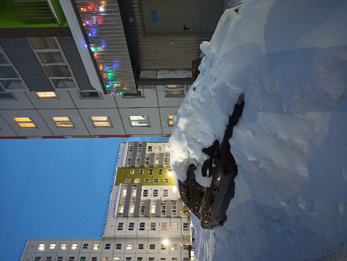 An outdoor scene in Кондратово, Russia, depicts a snowy urban environment at twilight. In the foreground, a dark-colored sedan is parked, almost entirely buried under a substantial accumulation of snow, obscuring its details except for its general shape and side profile. The ground is uniformly covered in deep, undisturbed white snow. To the immediate right, a multi-story residential building, primarily light grey with some green and darker grey facade elements, occupies the midground. Several windows throughout this building are illuminated with warm yellow light. Extending from this building at ground level is a canopy structure adorned with multicolored festive string lights, including red, green, blue, and yellow bulbs. Beneath the canopy, a grey metallic door with a blue sign is visible. In the left midground, another multi-story residential building, predominantly light-colored with green and grey accents, stands with multiple illuminated windows. Further in the background, a taller, light-colored apartment building is visible, also featuring numerous illuminated windows. The sky overhead is a clear, deep blue, consistent with a pre-dawn or post-sunset winter atmosphere. No individuals or active interactions are observed in the image.