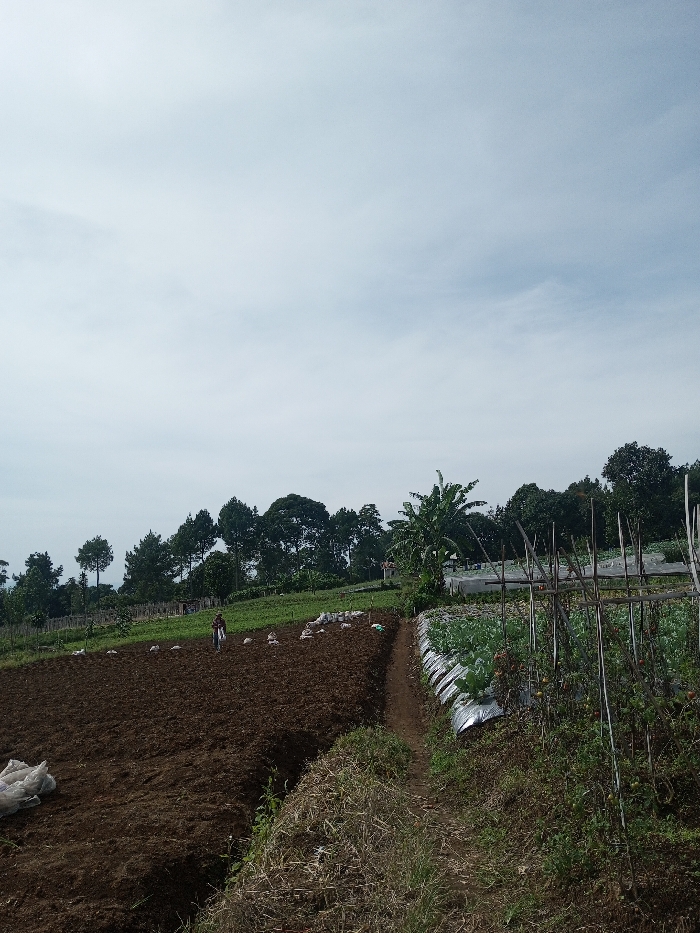 The image depicts an agricultural landscape in Kandenuwara, Sri Lanka, under a partly cloudy, light blue sky. In the foreground, a narrow dirt path ascends diagonally from the lower right, separating two cultivated areas. To the immediate right of the path, a mound of dry grass and soil is visible. Adjacent to this, a section of active cultivation shows rows of green plants, some protected by silver agricultural mulch film, with vertical wooden stakes supporting climbing vegetation, including plants bearing small red fruit. To the left of the path, a large field of dark brown, freshly tilled earth dominates the midground. Scattered across this field are multiple white sacks or bundles. A lone individual is observed walking from left to right across this tilled area, carrying a white object close to their body. They are dressed in a dark top and light-colored pants. Behind this tilled land, a strip of greener, cultivated crops is visible. The background features a dense line of diverse trees, including tall, coniferous-like specimens and broader deciduous trees, forming the horizon. A prominent banana palm tree stands out in the mid-right background, rising above the cultivated fields. A faint, indistinct structure can be seen nestled within the tree line slightly to the right of center.