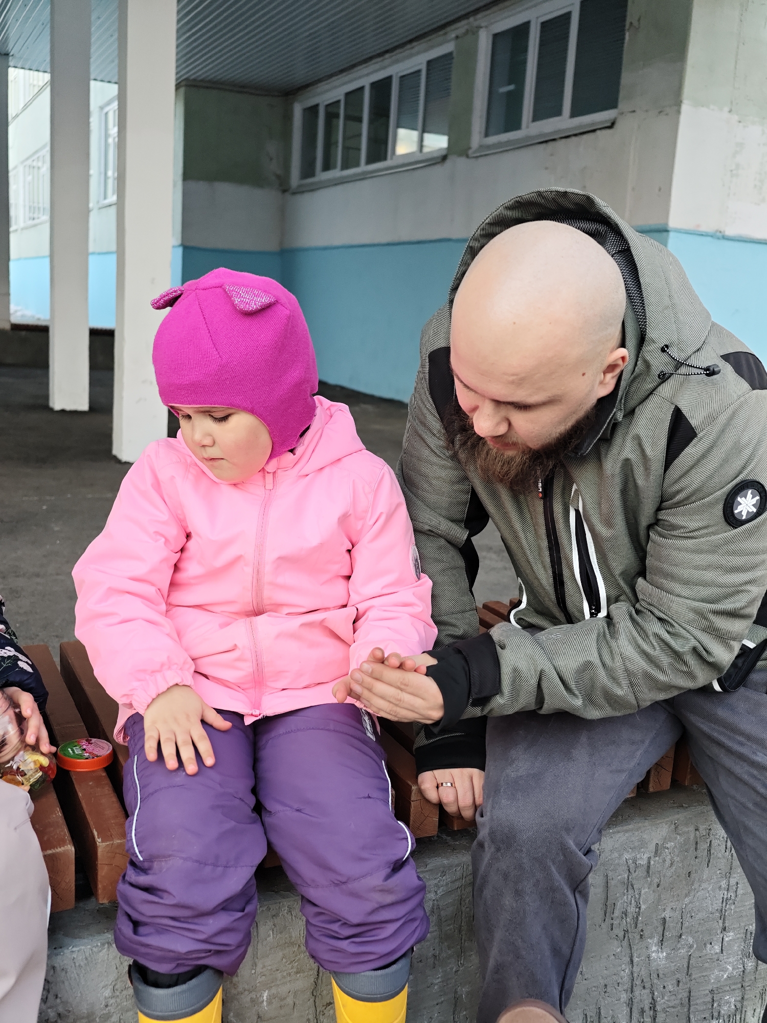 man and a young child sitting on a bench. The man is bald with a beard and wearing a patterned gray jacket, gray pants, and a black undershirt or gloves. The child is wearing a pink winter coat and hat, purple snow pants, and yellow boots. They appear to be holding hands. Other people are partially visible to the left of the child. Several small, round containers are visible on the bench to the left of the child. The background features a light blue and white building with visible windows. The location is Chaikovsky, Russia.