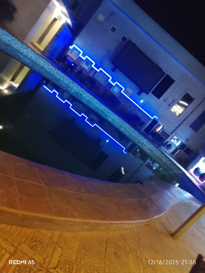 A dimly lit, tilted shot of a swimming pool area at night. The pool's edge, made of light brown tiles, is in the foreground. A modern building reflects in the pool's dark water, accentuated by blue neon lights outlining its edges. The building has visible windows and a dark awning. The image appears to have been taken with a mobile phone as evidenced by the watermarks.