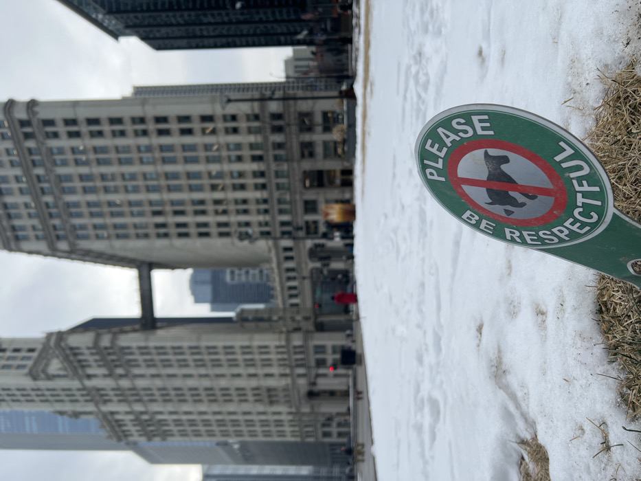 A "Please Be Respectful" sign is displayed in a patch of snow and dead grass. The sign has a green background and features a red circle with a black silhouette of a dog pooping inside, indicating that dogs are not allowed to defecate in the area. In the background, there is a street with a red traffic light and a person wearing a red jacket. Skyscrapers are also visible in the distance.