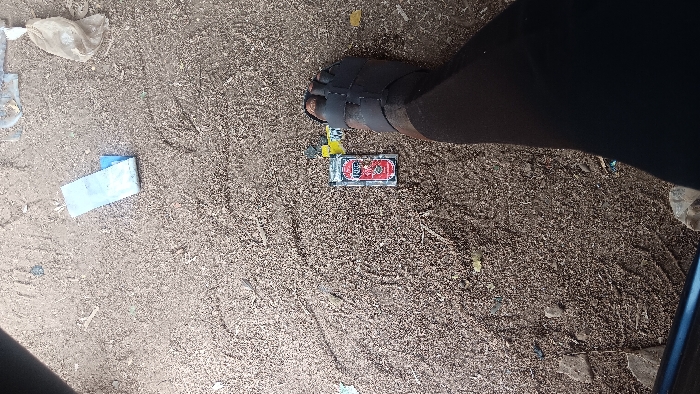 The scene depicts a high-angle view of an unpaved, dry ground surface, composed of sandy soil, fine gravel, and scattered debris. Resting on the ground near the center-right is a red and silver "KING" brand lighter featuring Chinese characters and a dragon design. Immediately adjacent to the lighter on the right is a dark-skinned left foot, partially visible and wearing a dark, multi-strapped open-toed sandal. In the upper left quadrant, a folded light blue plastic wrapper is present, with a crumpled, translucent plastic bag located further up and to its right. Various small fragments of discarded material are dispersed across the ground. A dark blue object, possibly a lower vehicle frame or structure, is partially visible along the bottom-left edge of the frame. The setting is outdoors under natural daylight, located in Langtang, Nigeria.