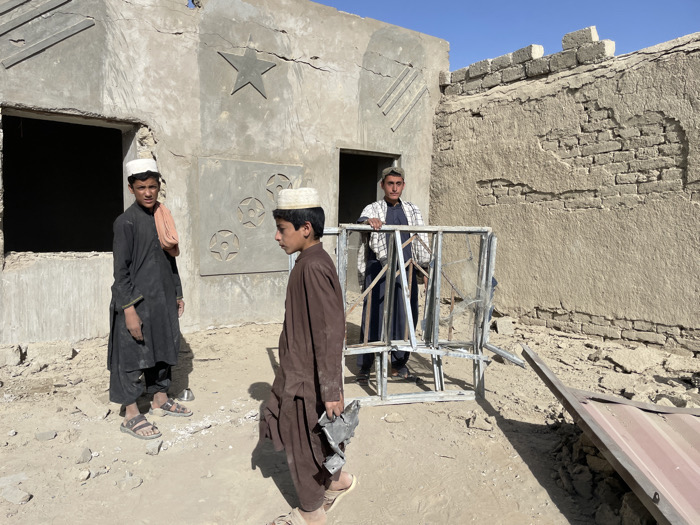 The image depicts an outdoor scene in Spin Boldak, Afghanistan, under a clear blue sky. Three young males are present amidst dusty ground and partially constructed or dilapidated buildings. **People:** 1. **Foreground Left:** A young male in a dark tunic (shalwar kameez) and open-toed sandals stands facing slightly right. An orange fabric is draped over his left shoulder, and he wears a light-colored cap. 2. **Foreground Middle:** A young male in a brown tunic (shalwar kameez) and open-toed sandals walks towards the right, appearing in profile. He wears a light-colored cap and holds a bent metallic object in his right hand. 3. **Background Right:** A young male in a dark tunic (shalwar kameez) and a plaid shawl stands behind a metal frame, looking directly at the camera. He also wears a light-colored cap. **Objects:** * **Building Left:** A light gray, concrete or stucco-covered structure with an empty window opening on the left. Its facade features decorative raised elements: a five-pointed star, three diagonal lines, and three circular motifs with internal star-like designs. Cracks are visible in the surface. * **Building Right:** An older, mud-brick structure, with significant portions of its outer rendering missing, exposing layers of mud bricks. The top edge of this wall appears uneven, suggesting damage or incomplete construction. * **Metal Frame:** A disassembled or damaged light-colored metal frame, possibly from a window or gate, stands leaning against the right building. It contains fragmented glass or a similar clear material. * **Fallen Object:** A large, flat, reddish-brown corrugated metal sheet or panel lies partially on its side on the ground to the right of the metal frame. * **Ground:** The ground is unpaved, consisting of dry dirt, scattered rocks, and construction debris. **Actions/Interactions:** The three individuals are standing in proximity within this outdoor space. The middle male carries a piece of debris, while the right male holds onto the metal frame. No direct interaction between the individuals is explicitly depicted; they appear to be observing their surroundings or the camera.