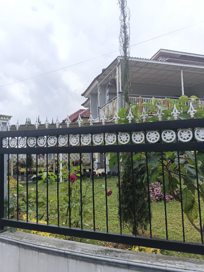 The image displays an exterior scene in Saisetha, Laos, under an overcast sky. A black metal fence, featuring white fleur-de-lis finials and circular medallions with starburst designs, extends horizontally across the mid-ground, resting on a weathered concrete base. Behind the fence, a well-maintained lawn with green grass is visible, containing various plants including a shrub with two prominent dark red flowers on the left, several potted plants further back, a slender, upright evergreen tree in the center-right, and a patch of reddish-purple foliage on the right. In the background, a multi-story house with a light gray facade, a red-tiled roof, and an upper-level covered balcony with a white railing is partially visible. A tall, thin, leafless pole or tree trunk stands vertically near the house, extending towards the sky. No people or active interactions are depicted.