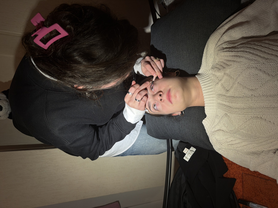 In a private interior setting within Strasbourg, France, two females are engaged in a beauty treatment. One female, dressed in a cream cable-knit sweater, lies supine with her head elevated on dark gray cushions. Small white pads are adhered to her lower eyelids, and her gaze is directed upward with open eyes. Leaning over her is a second female, wearing a black sweatshirt over a white undershirt, light blue jeans, and with dark hair secured by a pink claw clip and a white headband. This individual holds two small, light-colored stick applicators and is meticulously applying a substance to the first female's upper eyelashes. Visible in the background are a light-colored wall, a black object with a white label, a black marker, and a partially obscured, blurred stuffed animal. The scene is lit by a direct light source, creating distinct shadows.