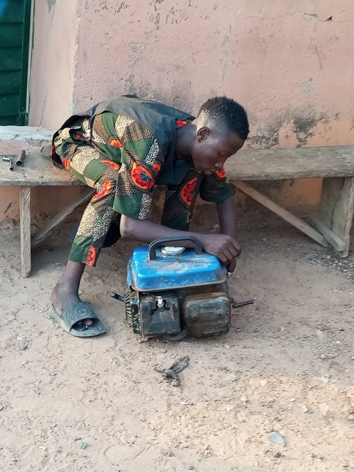 A young man in a patterned shirt sits on a wooden bench outdoors, focusing on a small blue engine on the ground. He appears to be working on the engine, possibly repairing or examining it. A wrench rests on the bench beside him. The ground is dirt, and a pair of sandals are on his feet. The background shows a building with a faded exterior.