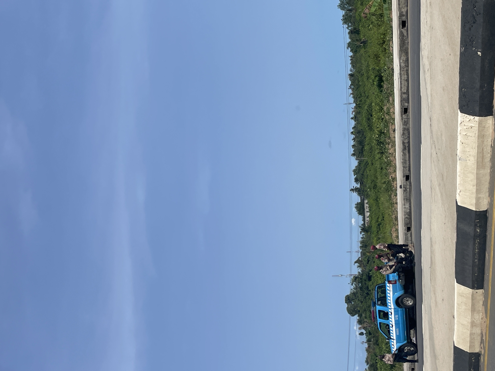 blue pickup truck parked on a concrete surface, likely a road shoulder or overpass, in what appears to be Ajara, Nigeria. People are positioned around the vehicle. Adjacent to the concrete area is a vegetation-covered slope. The sky is predominantly blue. The perspective of the image is rotated 90 degrees clockwise.