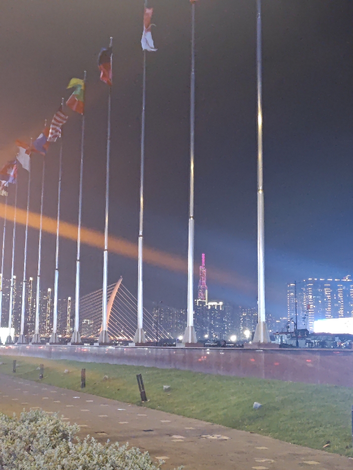 This is a nighttime long shot of an urban landscape in Thủ Đức City, Ho Chi Minh City, Vietnam. The image is dominated by a linear arrangement of approximately 14-15 tall, silver-colored flagpoles extending from the midground right to the midground left. Several flags, including what appears to be the flag of Vietnam and possibly other nations, are visible on the left side, fluttering. In the background, a modern cable-stayed bridge, identifiable as the Thủ Thiêm 2 Bridge, is visible with its white cables and illuminated structure. Behind the bridge and flagpoles, a dense cityscape is present, characterized by numerous illuminated high-rise buildings and skyscrapers. The most prominent background feature is the Landmark 81 skyscraper, distinguished by its brightly lit, pink-colored spire, positioned towards the right of the image center. A horizontal beam of orange light traverses the scene behind the flagpoles. The foreground consists of a paved pathway with square indentations, a section of green grass, and low-lying bushes on the far left. Dark, short posts are partially visible within the grass. A low, reddish-brown wall or barrier separates the immediate foreground from the area where the flagpoles are situated. The sky is dark, indicating night conditions, with artificial lighting illuminating the structures and flags. No individuals are visible.