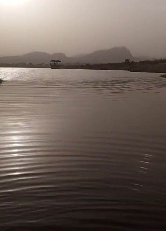 The video displays a tranquil body of water, appearing to be a lake, under an overcast sky with the sun attempting to pierce through