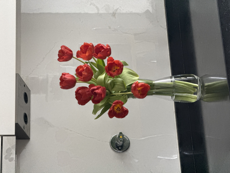 - "The scene, located in Funchal, Portugal, features a transparent glass vase containing eleven to twelve red tulips with green stems and leaves, placed centrally on a highly reflective, dark, possibly black, countertop" by FM-8ALHx1, licensed under CC BY 4.0