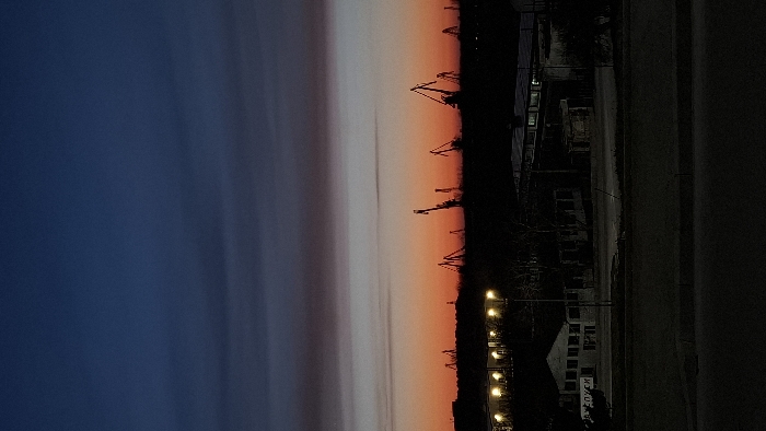 The image displays an urban-industrial landscape in Ruse, Bulgaria, captured during sunset or dusk. The sky features a gradient transitioning from a deep indigo blue at the top, through bands of muted grey and purple, to a prominent strip of vibrant orange and red along the horizon. Silhouetted against this colorful horizon are numerous tall, dark structures identified as port cranes, indicating the presence of a substantial maritime or riverine industrial facility. In the mid-ground, below the line of cranes, a mix of buildings and sparse, dark vegetation is visible. On the left side, a structure or outdoor area is brightly illuminated by multiple warm yellow lights. Adjacent to this, a white building displays partial Cyrillic text, confirming the city as "РУСЕ" (Ruse). Further to the right, other dark, indistinct buildings are present. A tall, slender pole, likely a street light, stands in the central mid-ground. The foreground consists of a wide, dark, unlit paved surface or road, separated from the mid-ground by a low curb or barrier. No individuals, vehicles, specific actions, or interactions are discernible. The overall scene depicts the Port of Ruse area along the Danube River, viewed from an elevated position.