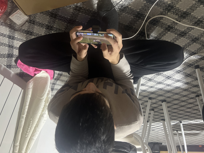 A person sits on a white chair, cross-legged, playing a mobile game on their smartphone. The device is held horizontally with both hands. The person wears a light brown sweater and dark pants. A cable stretches from the phone. A patterned rug covers the floor, with a box in the corner. A white radiator is on the left, and chair legs are on the right.
