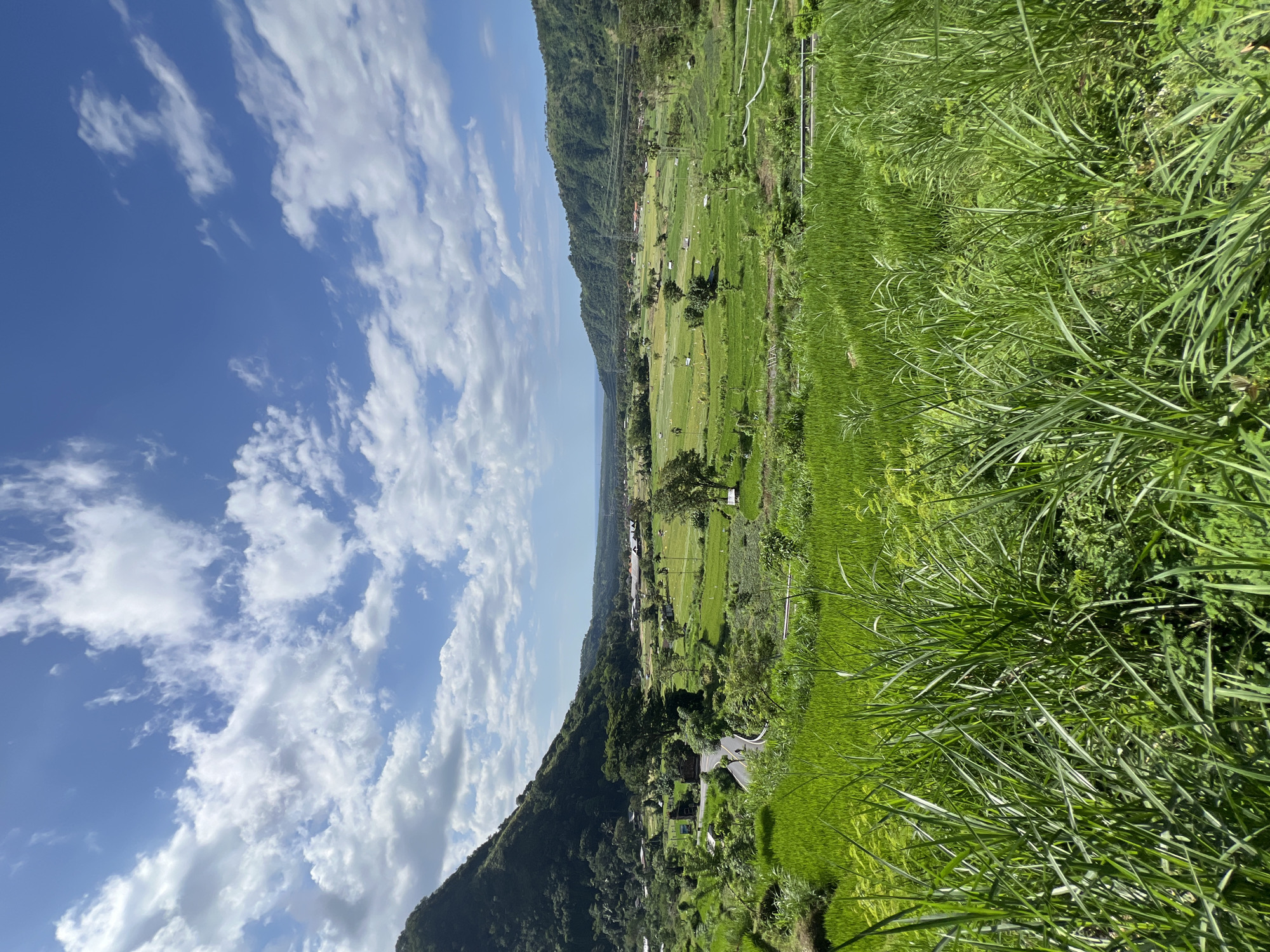 The image depicts a landscape in Abang, Indonesia. The sky is blue with scattered white clouds. A ridge of land runs from the lower left to the upper right of the image, dividing the scene. Below the ridge, terraced rice paddies are visible, interspersed with trees and structures. A road winds through the landscape. Tall, green grasses occupy the foreground on the right side of the image. In the background, a strip of the ocean can be seen.