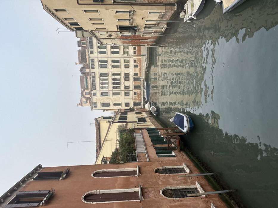 The image displays a narrow canal in Venice, Italy, observed on an overcast day