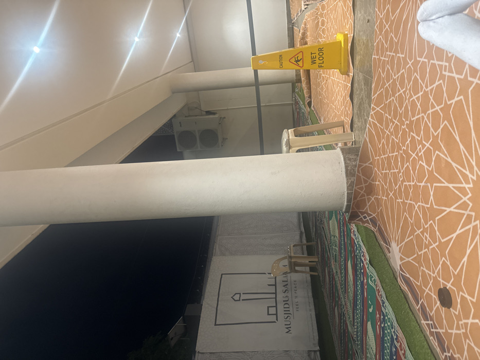 The image displays a nighttime scene within an outdoor or semi-covered area of Musjidu Salaam mosque, located at 21 Clayton Road, Overport, Durban, South Africa