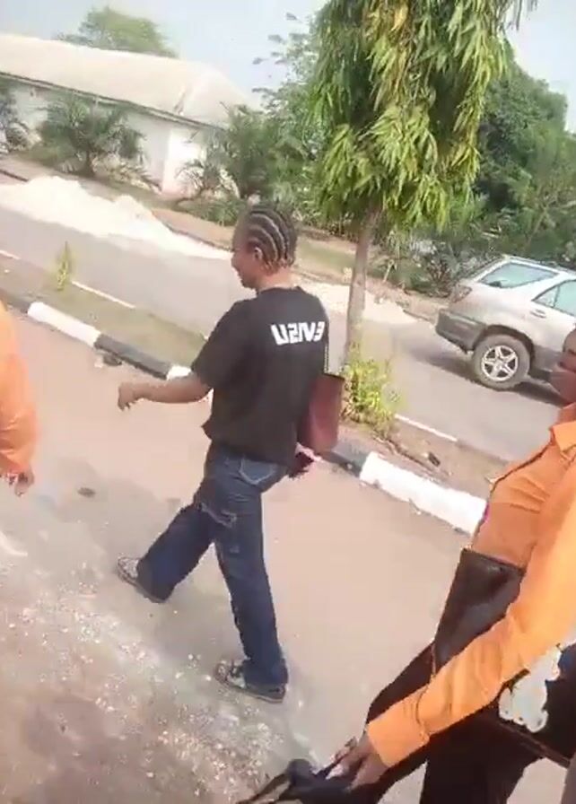 The video depicts three women walking along a street, likely in a residential area. The first woman is wearing a black t-shirt with white lettering on the back, blue jeans, and athletic shoes, with her hair braided. The second woman is wearing an orange shirt, black pants, and carrying a black purse. The third woman, who appears to be filming, is wearing a brown v-neck sweater and a silver necklace with a cross pendant. The environment includes a paved road, sidewalks with black and white painted curbs, trees, shrubs, and houses. There are cars parked along the side of the road and passing by. The woman filming turns the camera to show her face. She is making a playful or teasing expression, alternating between a pouting and smiling face.