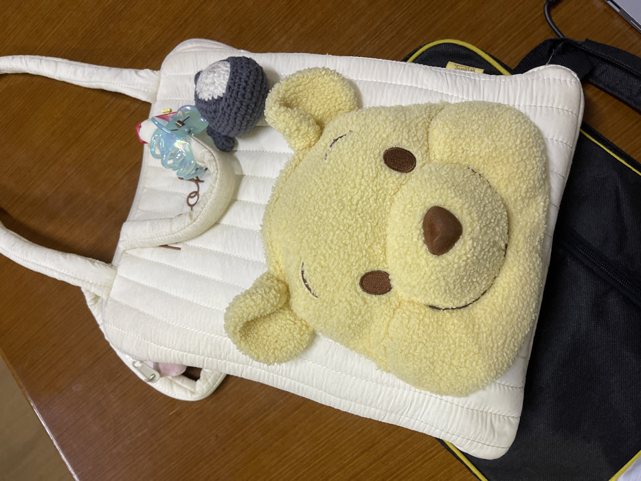 The scene displays a collection of personal items laid on a polished brown wooden surface, identified as being in the city of Muka, Indonesia. A cream-colored, vertically quilted tote bag with two top handles is centrally positioned. Resting atop the tote bag is a large, yellow, plush cushion shaped like Winnie the Pooh's head, facing forward with embroidered brown features. Attached to a small flap pocket on the front of the tote bag are two accessories: a translucent, iridescent blue hair claw clip and a small, gray and white crocheted spherical object. Partially visible beneath the bottom left of the cream tote bag is a section of a black carrying case with yellow trim, possibly a laptop bag. No individuals are present, and all objects are static.