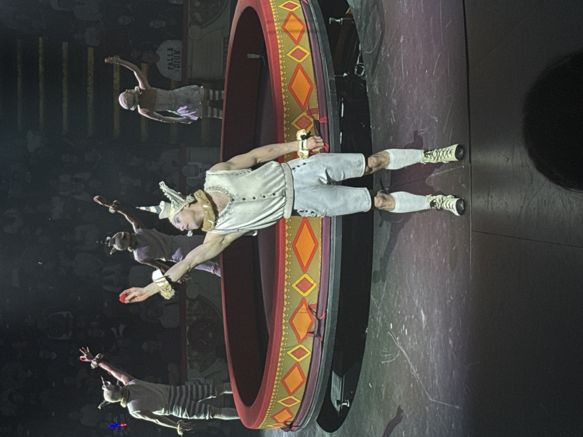 A live performance is depicted on a circular stage within the Great Moscow State Circus on Vernadsky Avenue, Moscow, Russia. Four performers are visible. In the foreground, a muscular male performer stands centered, facing slightly right, wearing a cream-colored sleeveless top, light grey shorts, white socks, and light green lace-up boots. He has a ruffled collar, a pointed white headpiece, and a wide wristband. His right arm is extended upward, holding a small red object, while his head is turned upwards and right. Behind him, three additional performers are positioned around a large, circular, elevated stage prop. To the far left, a male performer, seen from the back, wears a striped top and a horned headpiece, with both arms raised, his left hand holding a red object. To his right, another performer, also viewed from the back with a similar headpiece, raises his right arm with a red object. To the right of the central performer, a performer, likely female, is seen from the back, dressed in a corseted top, shorts, and a light headpiece, with her left arm raised, holding a red object. The circular stage prop is adorned with a pattern of red, orange, and yellow diamonds on a greenish-gold band, topped with a deep red surface. The stage floor is dark and shows signs of wear. The background features rows of indistinct audience members seated in darkness. One audience member on the far right wears a white t-shirt with "PALLA & DIUK" printed on it. The scene is illuminated by focused stage lighting.