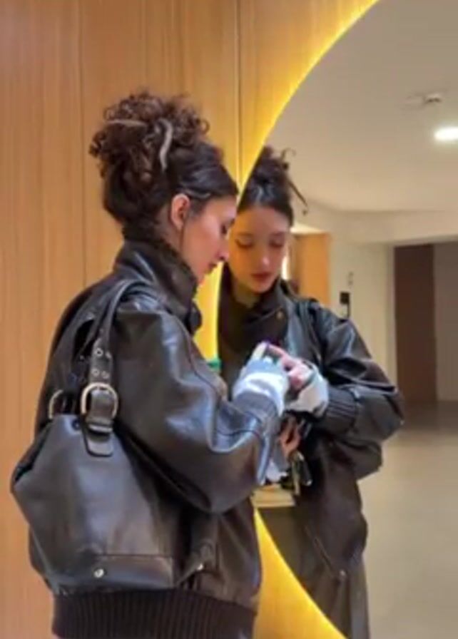 A young woman stands in front of an oval mirror in an indoor hallway. She has her hair piled on her head with some lighter strands coming loose. She is wearing a brown leather bomber jacket, gray pants, and a black leather purse with silver buckles. She is looking at her phone in her hands. The wall behind her is wood grain. The hallway reflected in the mirror is modern with light-colored walls.