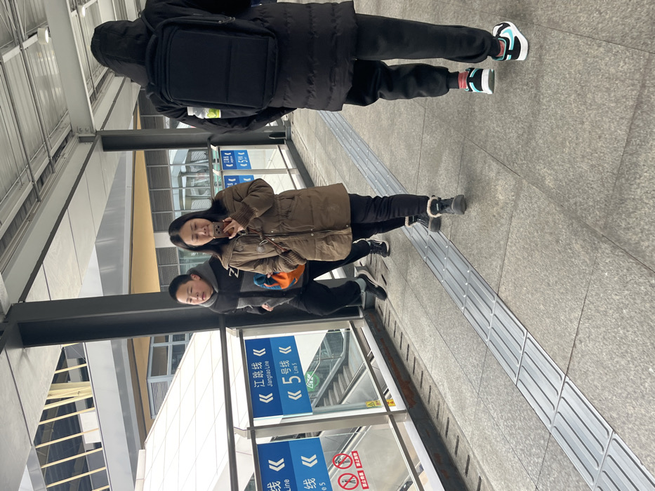A group of people, including a person wearing a brown jacket, are captured in an image taken at a train station or subway platform. Signage indicates "Jiangtiao Line" and "Line 5." The perspective is somewhat tilted, showing the platform's gray tiled floor and tactile paving. An individual in a black jacket and backpack walks by, while others are closer to the camera, seemingly taking a photo.