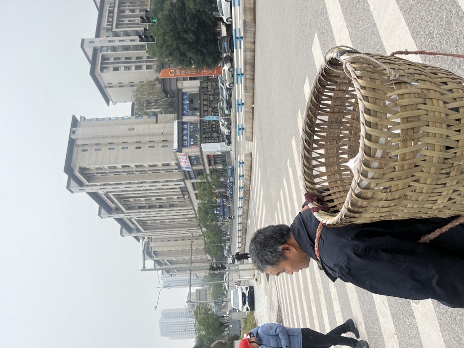 A man carries a large, woven basket on his back while crossing a zebra-striped crosswalk in an urban setting. He wears a dark jacket. In the background, tall buildings line the street, stretching into the distance under a cloudy sky. Cars are visible parked along the curb and driving on the road. Another person wearing a blue jacket and a red hard hat walks nearby.