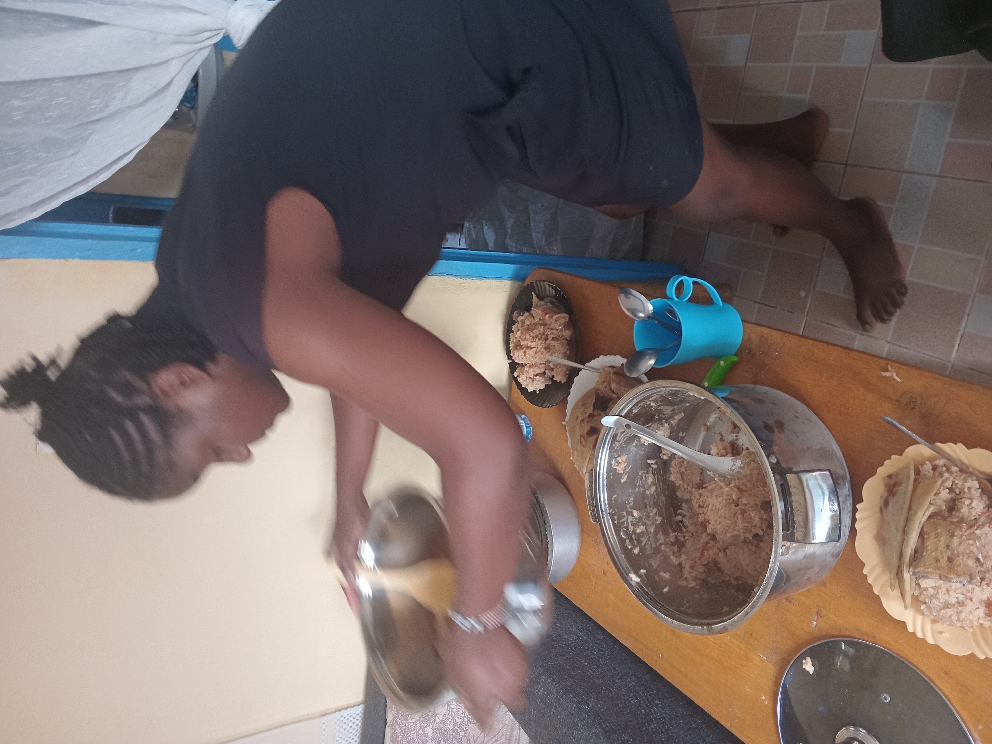 A person is shown in an indoor scene likely in Matulo Ward, Kenya. They are leaning over a wooden surface on which there are several plates of what appears to be food, a cooking pot, and a blue mug filled with utensils. The person is holding a cooking utensil or pot. The environment suggests a modest domestic setting.