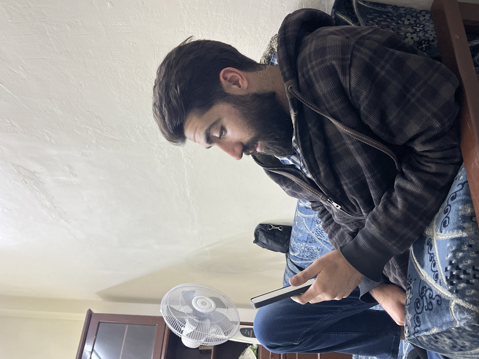 An interior scene in Zamalka, Syria, shows a male individual seated on a blue patterned sofa. The man, observed in left profile, possesses dark hair styled upwards and a full, neatly trimmed dark beard and mustache. He is wearing a dark brown and grey plaid hooded jacket over a blue and white checkered shirt, paired with dark blue jeans. His left hand holds a black-cased mobile device, towards which his gaze is directed. The sofa features wooden armrests and is upholstered in a blue fabric with a lighter, repeating pattern. In the background, a white pedestal fan is visible to the left, positioned near a dark brown wooden cabinet with a glass door. A small black pouch with a metallic clip rests on the back of the sofa behind the man. The walls are light-colored, exhibiting some surface texture.