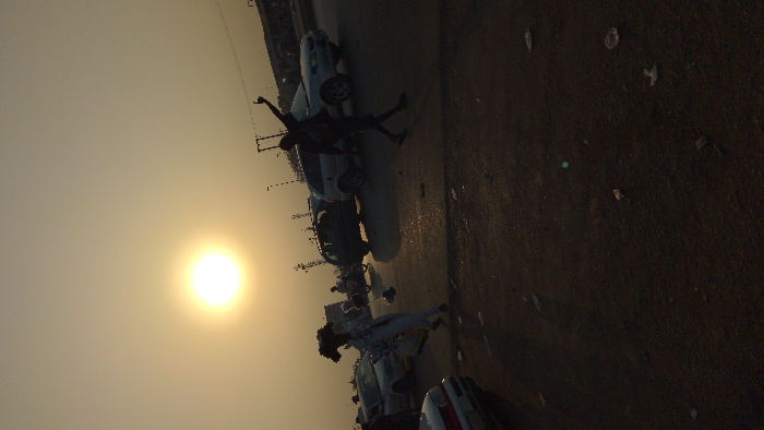 An image captures a scene at sunset, filled with rows of parked vehicles along a roadside. The sun, a bright disc in the hazy sky, casts long shadows. Two figures near the center exhibit contrasting actions, one with arms raised, possibly celebrating, while the other stands nearby, facing in the opposite direction. The overall composition suggests a moment of camaraderie amidst a backdrop of urban or suburban development.