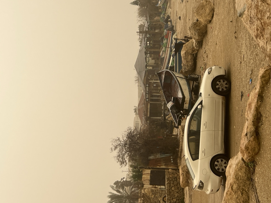 The image depicts a static, outdoor scene in Jisr az-Zarqa, Israel, likely a beachfront or harbor area, under hazy, light brown atmospheric conditions consistent with a sandstorm or heavy dust