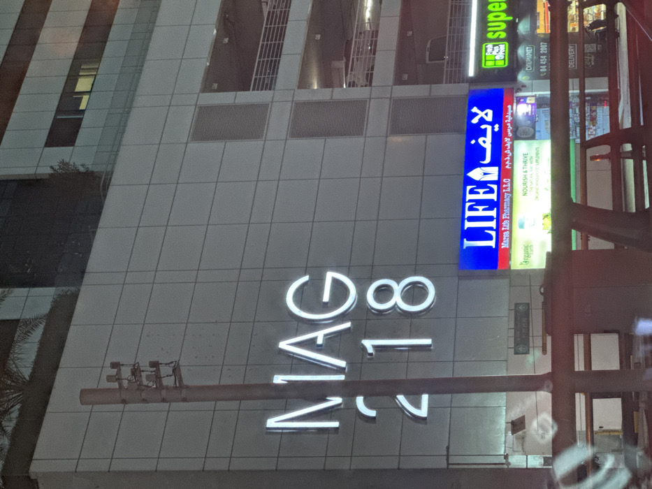 building with the name "MAG 218" in large, white letters