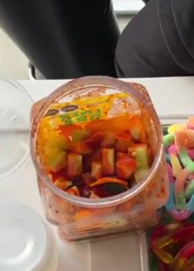 A high angle view shows a container of diced fruit, including watermelon and melon, covered in red chili powder. The container is sitting on a white surface with other containers of colorful gummy worms, chili sauce, and lids. A person wearing black appears to be picking at the contents of the container.