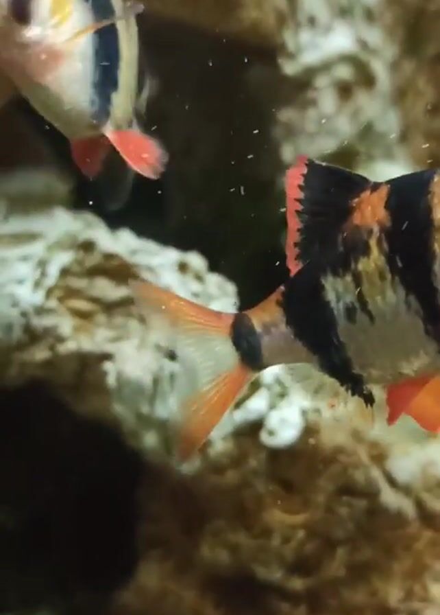 close-up of two tiger barb fish in an aquarium. The fish have black stripes with orange and white coloring. They have red fins. The background of the aquarium includes rocks, small green plants, and a few small colored beads. The water is clear, with some visible particles floating within. The fish are swimming around the aquarium.