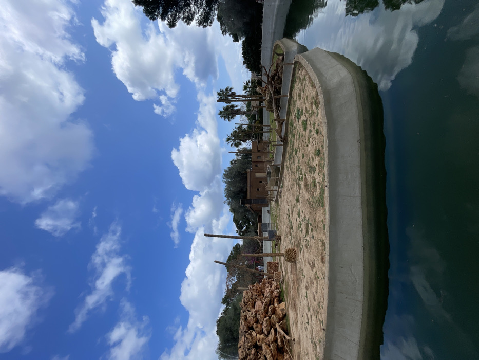 This image depicts an outdoor animal enclosure within the Safari Zoo Sa Coma, located in Sant Llorenç des Cardassar, Spain. The scene is captured under a bright blue sky marked by scattered white cumulus clouds, which are reflected in the dark green water that occupies the foreground and forms a moat. A low, light grey concrete retaining wall defines the perimeter of a semi-circular, man-made island habitat. The island's surface consists of dry, sandy earth with sparse patches of green vegetation. On the left side of the island, a substantial mound of reddish-brown rocks and logs is visible. Multiple tall, debarked wooden poles or trunks are vertically embedded in the ground across the island, some stabilized by small rock formations at their bases. Towards the center-right, a two-story, flat-roofed structure, constructed from brown material and resembling an animal shelter, is situated. Adjacent to this structure, another section of the island contains additional logs and branches arranged as habitat enrichment. A narrow channel of water separates the main island segment from a smaller land strip to its right. A single individual, dressed in light-colored clothing, is faintly visible in the distant background near the large rock pile. Beyond the enclosure, a dense line of trees, including several tall palm trees, forms the background, partially obscuring additional park structures.