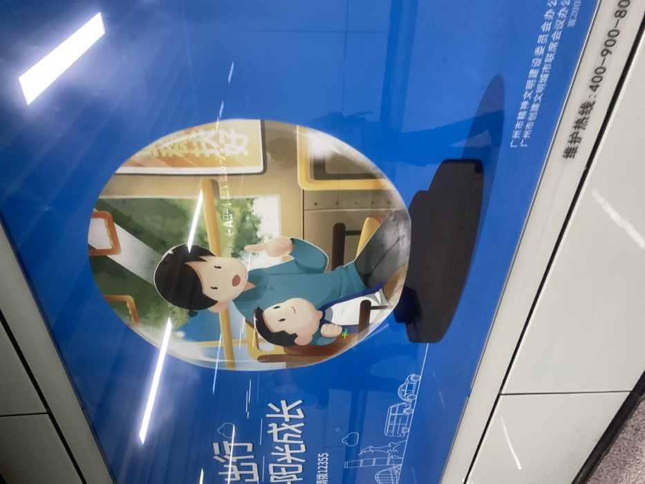 The image depicts a poster or advertisement, possibly in a subway station, with a cartoon-style illustration of a father and child on a bus, pointing towards something outside the window. The text includes phrases about "positive growth," a hotline number "12355," and mentions the Guangzhou Spiritual Civilization Construction Committee Office, along with a maintenance hotline number: 400-900-800. The poster has a blue background with various transportation-related icons at the bottom.