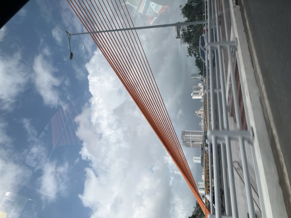 The image depicts a daytime scene from the Trần Thị Lý Bridge, looking generally east or southeast towards the city skyline, located in Da Nang, Vietnam, with elements of Hòa Cường Ward visible or implied nearby. The sky features a mix of clear blue patches and large, white cumulus clouds, with darker, more overcast clouds on the horizon. In the foreground, the asphalt road surface of the bridge is visible, with a light gray concrete barrier and multi-bar metal guardrail running along the right side. Several parallel orange cable stays of the bridge ascend diagonally from the lower-left to the upper-right of the frame. A tall gray street light pole with a curved lamp arm stands on the right side, extending upwards. Reflections of the vehicle's interior and external objects are visible in the upper portion of the image, suggesting the photograph was taken through a window. On the bridge road, a dark-colored SUV is partially visible, and other vehicles appear as blurs further along. Beyond the bridge's immediate structure, a cityscape is visible, dominated by numerous multi-story buildings and high-rise structures, including a prominent, light-colored tall building with distinct vertical elements. Further in the background, another bridge structure with yellow/brown trusswork is discernible. Sparse green foliage is also present along the distant shoreline, bordering some of the lower buildings.