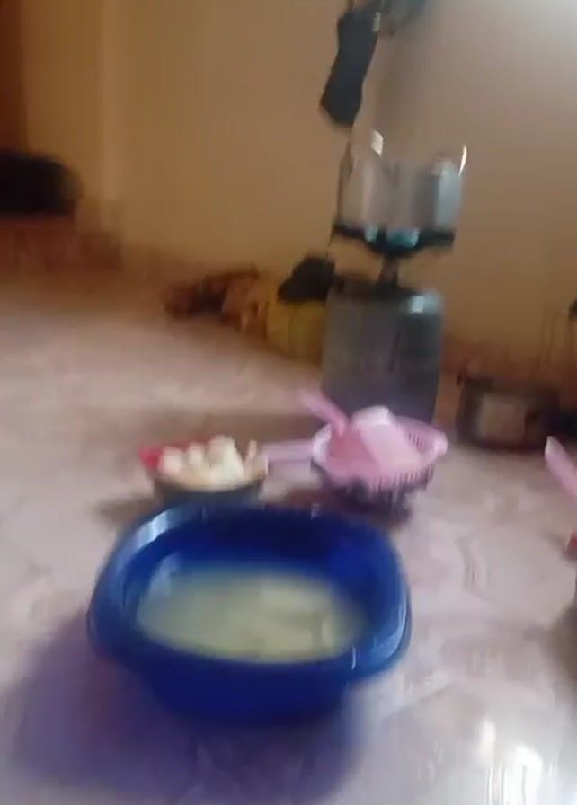 room with tiled floors, containing various kitchen utensils, a propane tank with a pot on top, and a dog sleeping in the background. A blue plastic basin filled with a light-colored liquid and chunks of something floating in it is in the foreground. Next to it is a small bowl with cut pieces of food and a pink strainer. The pot on top of the propane tank appears to be on a burner. A window is visible in the background, with some clothing hanging near it.