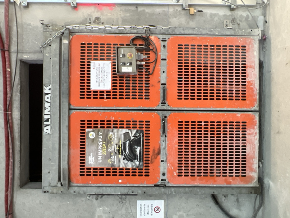 - "The image displays an ALIMAK industrial construction hoist door, positioned within a concrete structure, likely at a construction site in Aulnay-sous-Bois, France" by FM-ltjrj1, licensed under CC BY 4.0