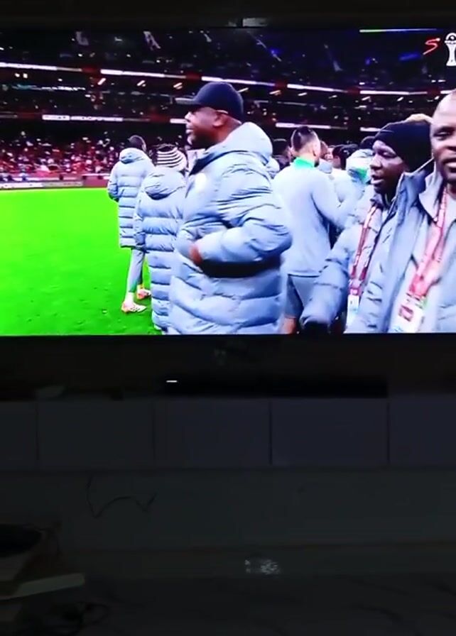A TV screen displaying a soccer team warming up on the field. The players are wearing blue puffer jackets. One player in the middle is wearing a yellow jersey with the number 23. The background shows a stadium with spectators and bright lights. The TV is resting on a white tiled surface, and there are some wires and objects visible in the foreground.