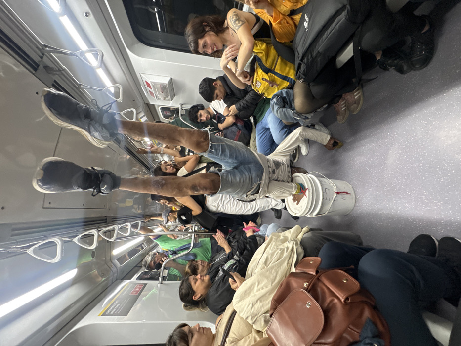 Inside a crowded train, a man in jeans shorts and white shirt stands on a white bucket with his feet pointing upwards. He is surrounded by seated passengers. Some are looking at their phones, others at him. There are silver handrails near the train's windows. Luggage and personal items such as a yellow jacket, a black backpack and a brown bag fill the scene. The train is brightly lit from above.