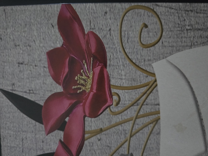 Located in Dar Bouazza, Morocco, this image displays a close-up of a decorative artwork, likely a wall tile or print. The central subject is a large, stylized flower with prominent, rich deep pink petals and a textured golden yellow center. Behind and to the left of the main flower are slender, dark, elongated leaves. Multiple thin, golden-brown metallic-appearing stalks or stems curve upwards from the bottom of the frame, with one prominent stem curling into a spiral shape on the right. These elements originate from an abstractly shaped, light grey or off-white vase-like object visible at the lower portion of the image. The background is a textured grey surface, resembling distressed concrete or weathered wood. No people, actions, or interactions are visible.