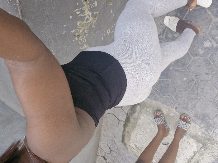 An overhead perspective photograph taken in Ado, Nigeria, depicts two individuals on a paved surface. The primary subject, largely visible in the foreground, possesses dark skin and wears a black tank top, grey leggings, and white open-toed slides on bare feet. A silver chain is visible around their neck. The subject's arm is extended into the foreground, indicating a self-portrait capture. In the background, the lower legs and feet of a second individual are visible, also possessing dark skin, wearing patterned grey and white open-toed slides on bare feet. The ground beneath both individuals is composed of grey hexagonal concrete pavers, with some sections exhibiting lighter, possibly worn or stained concrete. A plain grey vertical wall or structure is present along the right edge of the frame.