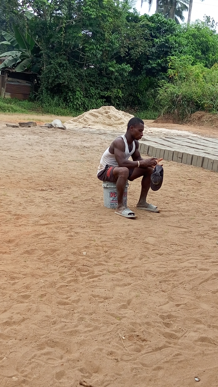 An adult male sits outdoors on an overturned light-grey bucket in a sandy clearing within the city of Unknown, Unknown. He wears a white tank top, dark shorts with red accents, and light grey slide sandals. His left hand holds a dark cap, while his right hand holds a small, light-colored rectangular object, possibly a mobile phone, which he appears to be observing. Behind him, to his left, is a mound of light-colored sand. To his right, rows of grey concrete blocks are neatly arranged on the ground. The background consists of dense green foliage, including banana trees and taller trees, with a small, rustic structure featuring a corrugated metal roof partially visible on the far left. The ground is unpaved, consisting of reddish-brown sand with numerous footprints and scattered small bits of vegetation.