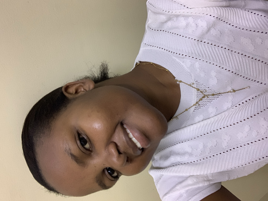 A single adult female of African descent is depicted in a chest-up portrait, smiling directly towards the viewer