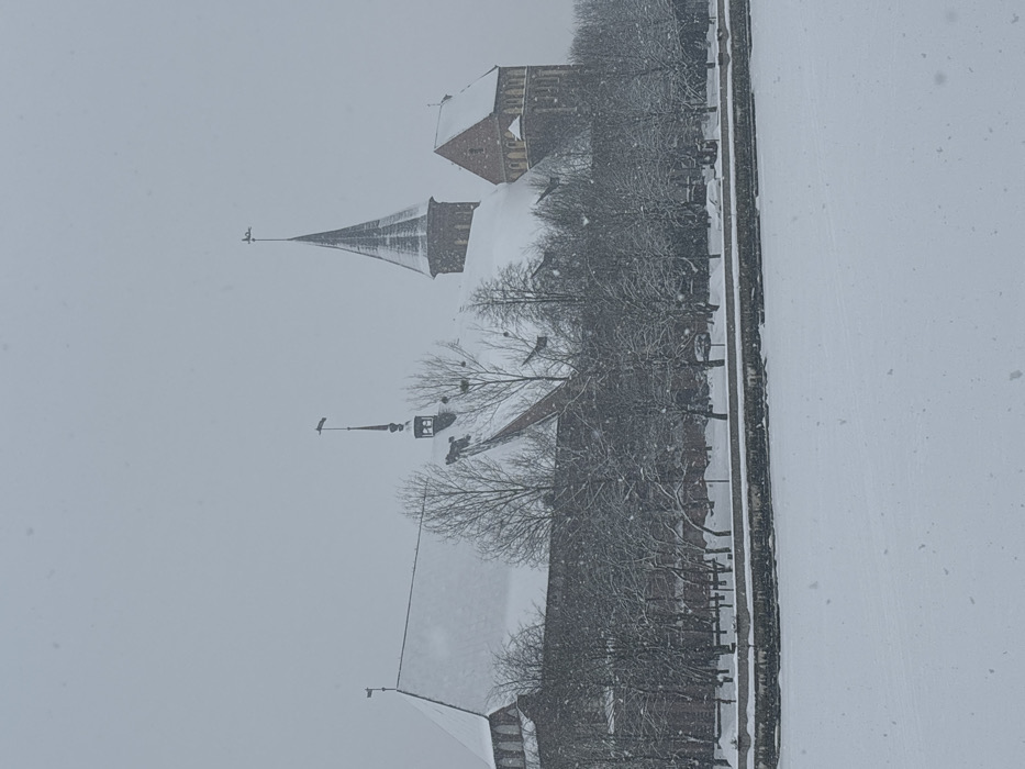 The image depicts the Kaliningrad Cathedral (also known as Königsberg Cathedral), situated on Kant Island in Kaliningrad, Russia, viewed from across the frozen or snow-covered Pregolya River. The scene is dominated by a heavy snowfall under an overcast, gray sky. Snowflakes are visible throughout the frame. The foreground consists of a uniformly white, flat surface, indicative of a frozen body of water or densely packed snow covering it. A snow-laden riverbank or quay wall runs horizontally across the midground, separating the water from the land. Along this bank, numerous bare deciduous trees stand, their branches heavily coated with snow. A light-colored vehicle, obscured by snow, is partially visible behind the trees towards the right. The background is anchored by the Kaliningrad Cathedral, a large Gothic-style building constructed of dark red brick. Its multiple roof sections are thickly covered in white snow, contrasting with the visible brickwork. The cathedral features a prominent central conical spire topped with a finial. To its left, a smaller, more intricate spire is visible, also snow-dusted, with a banner or pennant at its apex. A squarer, multi-storied tower is situated on the far right side of the cathedral structure. No individuals or discernible activities are present within the frame. The overall environment suggests a cold, static winter day.