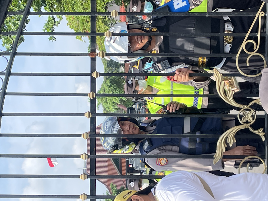 An outdoor scene in Kecamatan Pati, Indonesia, depicts uniformed personnel behind a black metal gate with gold accents