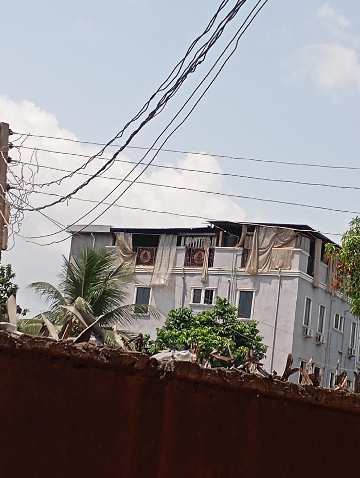 The scene captures a multi-story building in Onitsha, Nigeria, viewed from behind a reddish-brown wall topped with sharp security elements