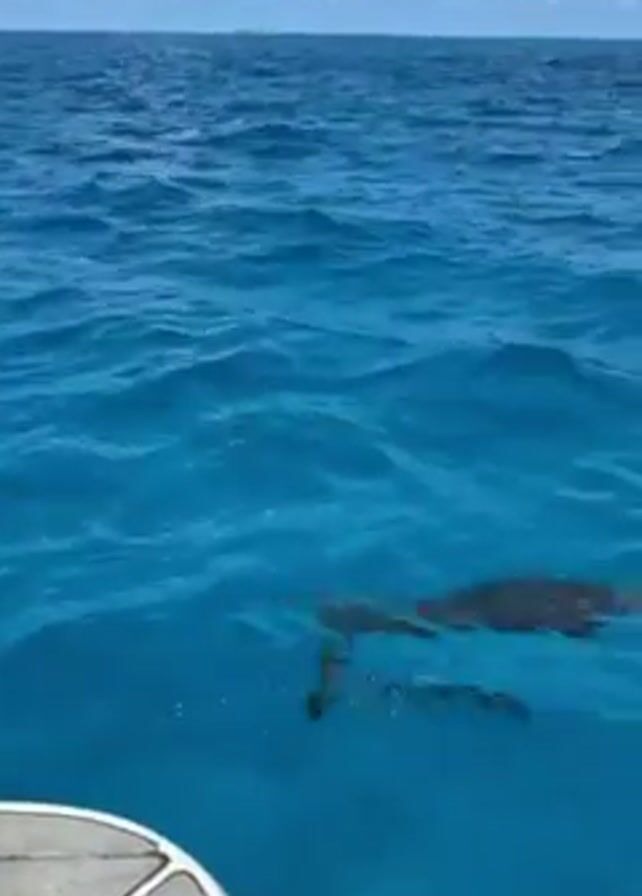 body of water in an open environment on a partly cloudy day. The water is a striking turquoise-blue, rippled by gentle waves. In the distance, a flat horizon separates the sea from the sky. Close to the lower left corner of the frame is a section of a boat's gunwale, white and gray. Swimming in the water is a sea turtle. Its movements are visible as it propels itself through the water, leaving a rippling wake.