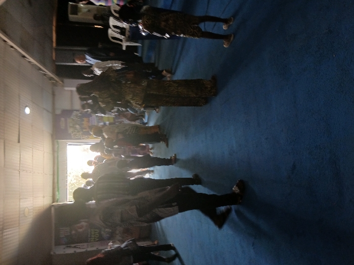 The image depicts an indoor gathering space in Aviation Quarters, Nigeria, characterized by a deep blue carpeted floor and off-white walls