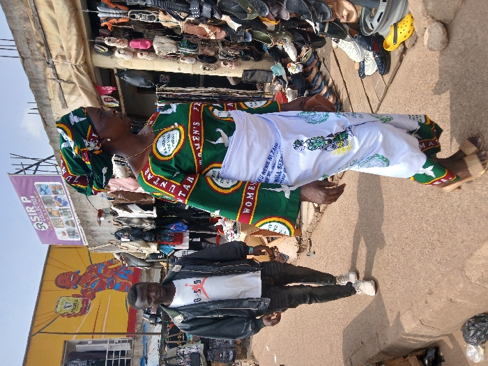 The image captures an outdoor street or market scene in Heany, Zimbabwe. In the immediate foreground, a dark-complexioned woman, appearing middle-aged, walks towards the right. She wears a multi-patterned headwrap, a long-sleeved green tunic with red, yellow, and white patterns and "WOMEN'S" text, and a white wraparound skirt featuring figures and text including "AKU NENE NI ZANI WILL SEE." She wears light brown, low-heeled open-toed sandals and a gold-colored necklace. To her left and slightly behind, a dark-complexioned man, appearing younger, walks forward, looking directly at the viewer. He wears a dark jacket over a white t-shirt with a red and black "Jordan" logo, dark jeans, and white athletic shoes. The ground is an uneven light-colored pavement. In the background on the left, a yellow building wall features a large mural of a smiling woman holding a "MALTA" can. Below the mural, an open stall displays clothing items. To the right, a purple banner reads "SIR P COLLECTION" above a structure displaying various garments. On the right side of the frame, a market stall under a brown canopy exhibits numerous shoes and sandals, including yellow Crocs, hanging from hooks and arranged on shelves against a concrete wall.